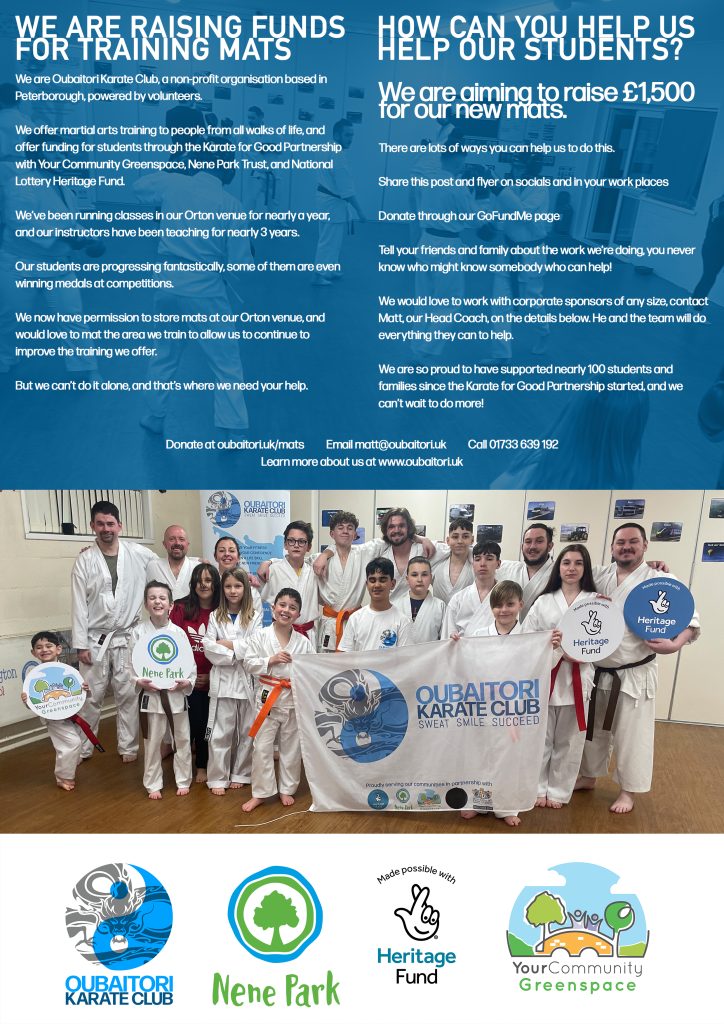 We are raising £1,500 for training mats for our Orton classes. These will make a massive difference to the training we are able to offer for our students with the Karate for Good Partnership.